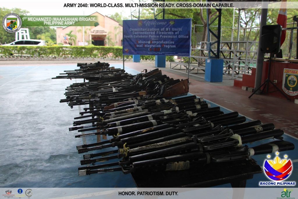 GENERAL SANTOS CITY – In a significant stride toward lasting peace, the Enhanced Comprehensive Local Integration Program (E-CLIP) Committee of South Cotabato, in collaboration with the Regional Police Office XII (PRO 12), successfully demilitarized 91 surrendered firearms during a ceremonial event held at the PRO 12 Covered Court, Camp Gen. Paulino T. Santos, Tambler, General Santos City.