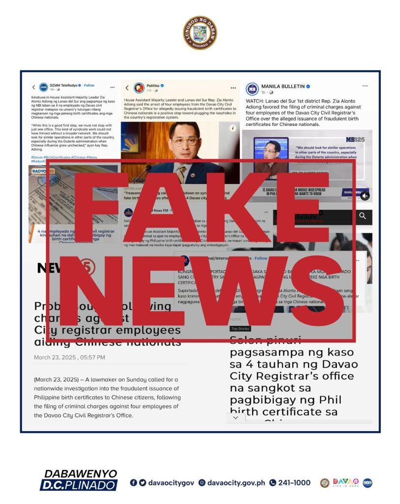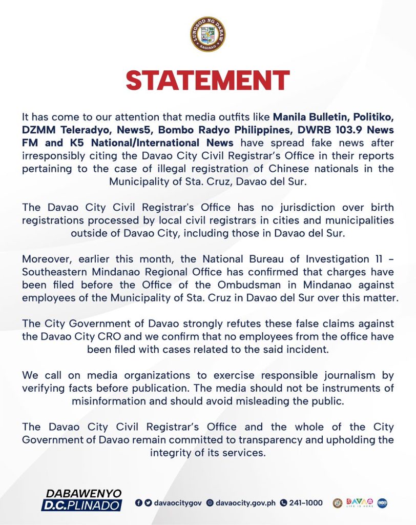 Davao City, Philippines – The Davao City Government has strongly refuted false reports circulated by several media outlets regarding the alleged involvement of its Civil Registrar’s Office (CRO) in the illegal registration of Chinese nationals in the Municipality of Sta. Cruz, Davao del Sur.