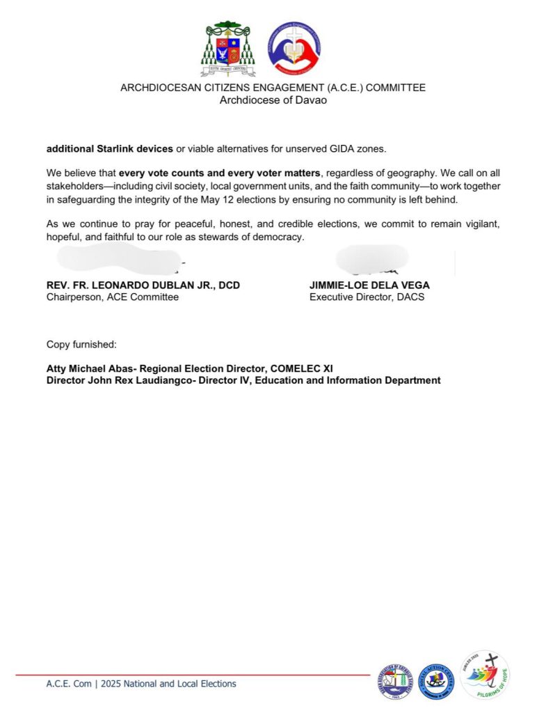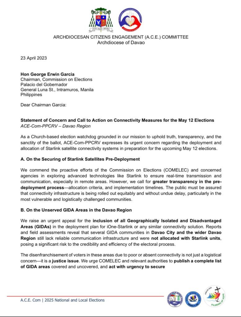 The Archdiocesan Citizens Engagement (A.C.E.) Committee of the Archdiocese of Davao has issued a blunt and urgent call to the Commission on Elections (COMELEC): fix the connectivity crisis in remote Davao communities now—or risk compromising the integrity of the 2025 elections.
