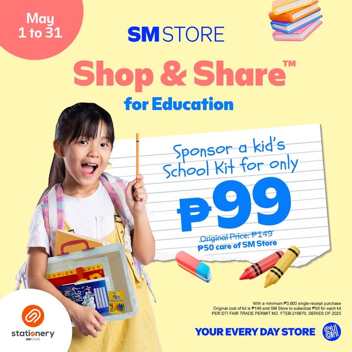 This May, SM Store is calling on Filipino shoppers to join its Shop & Share for Education campaign, a Corporate Social Responsibility (CSR) project that aims to provide school kits to underprivileged children nationwide. Running from May 1 to 31, the campaign allows customers to donate a complete back-to-school kit for only ₱99 with a minimum ₱3,000 single-receipt purchase at any SM Store branch.