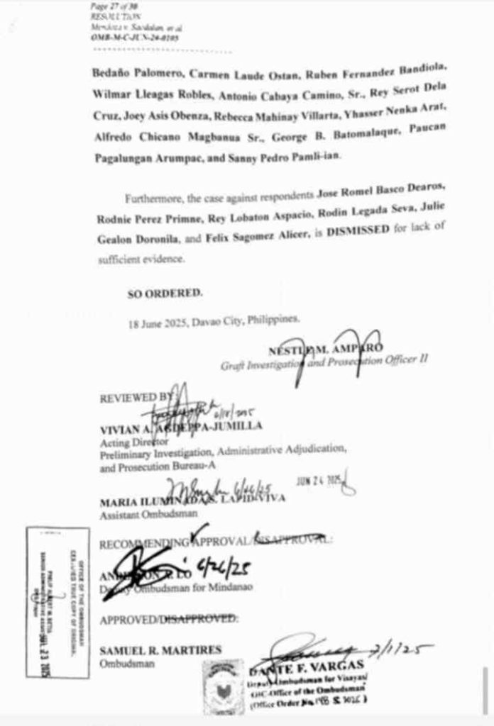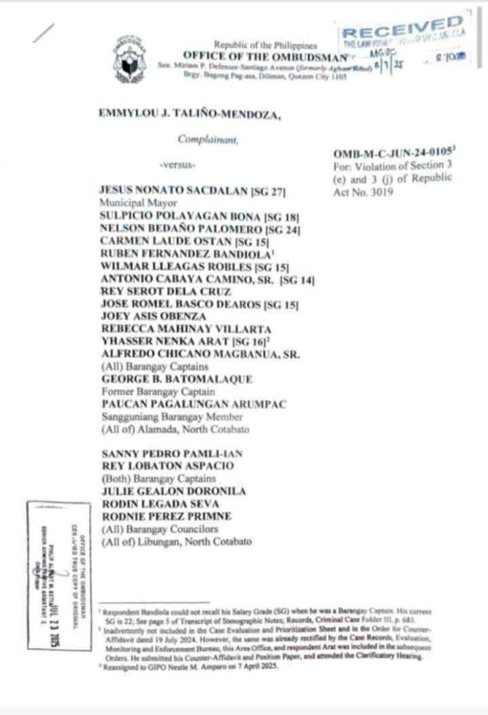 Also charged were barangay captains Sulpicio Polayagan Bona, Nelson Bedano Palomero, Carmen Laude Ostan, Ruben Fernandez Bandiola, Wilmar Llegas Robles, Antonio Cabaya Camino Sr., Rey Serot dela Cruz, Joey Asis Obenza, Rebecca Mahinay Villarta, Yhasser Nenka Arat, and Alfredo Chicano Magbanua Sr. Former barangay chairmen George Batomalaque and Sanny Pedro Pamili-ian, as well as former kagawad Paucan Pagalungan Arumpac, were likewise implicated.