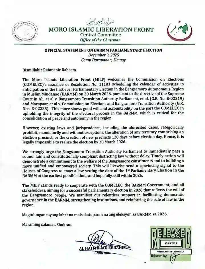 In an official statement issued December 9 from Camp Darapanan, MILF Chairman Al Haj Murad Ebrahim acknowledged the Commission on Elections’ (COMELEC) recent Resolution No. 11181, which laid out preparations for the long-awaited regional polls following directives from the Supreme Court. The MILF said this move signals good faith on the part of COMELEC in ensuring transparent and credible elections in the Bangsamoro Autonomous Region in Muslim Mindanao (BARMM).