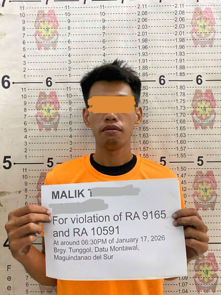 The suspect is now in the custody of the Datu Montawal Police, facing charges for violations of Republic Act 9165 or the Comprehensive Dangerous Drugs Act of 2002, and Republic Act 10591, or Illegal Possession of Firearms and Ammunition.