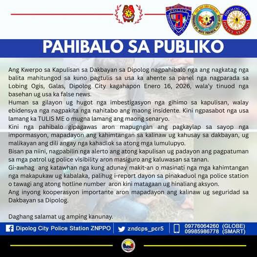 In an official public advisory, the Dipolog City Police Station emphasized that the widely shared reports of a robbery in Barangay Galas were “fake news” and urged the public to remain vigilant but discerning.