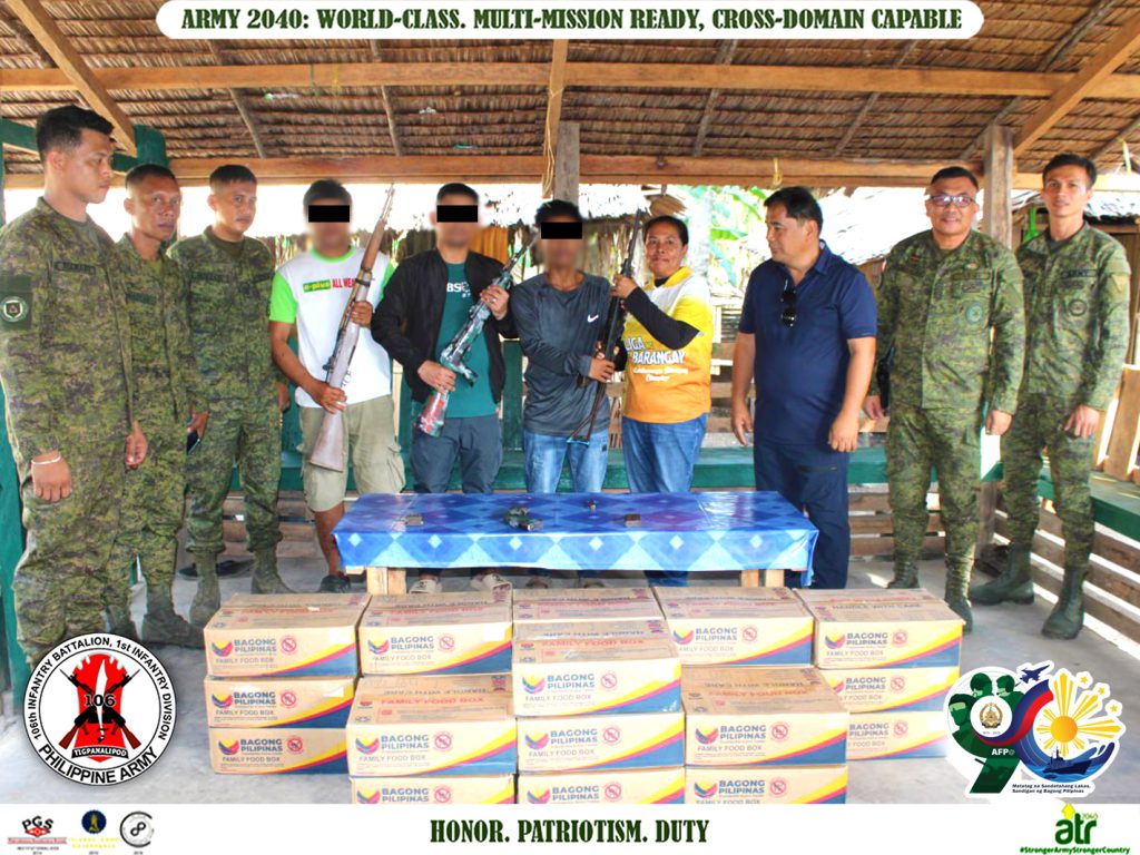 As part of the whole-of-government approach, the LGU of Payao provided food packs to the firearms owner, underscoring the collaborative effort between the military, local officials, and community stakeholders to encourage voluntary participation in peace initiatives.